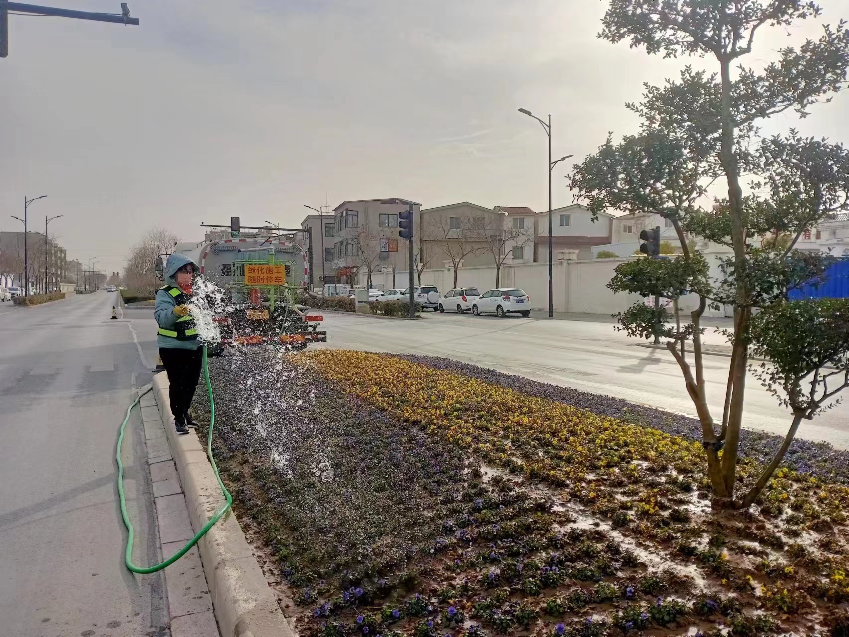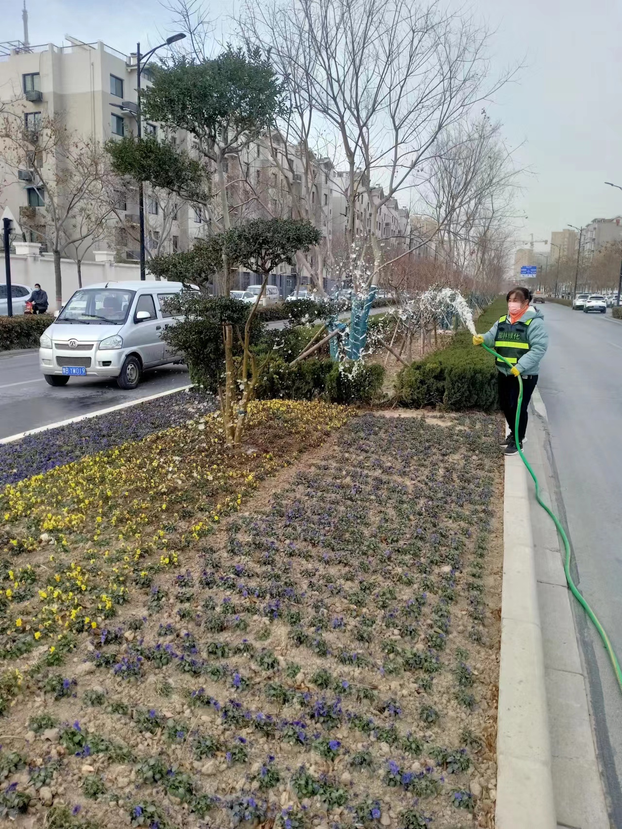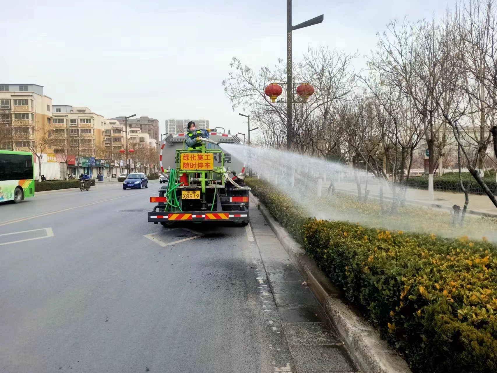 截至目前,已完成解放路、西门大街全段浇灌,城区其他路段正在按计划有序进行。