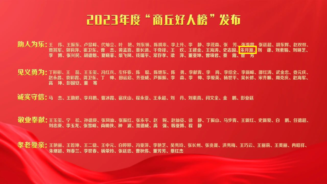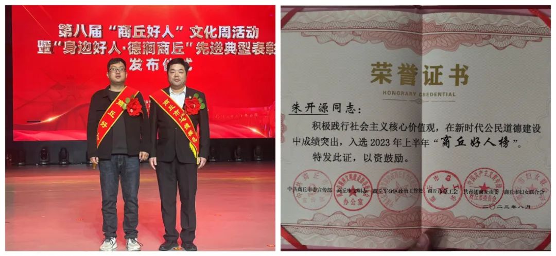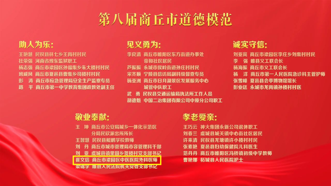 3月23日,商丘市举办第八届“商丘好人”文化周活动暨“身边好人·德润商丘”先进典型表彰发布仪式。商丘市第三人民医院医疗集团(梁园区中医院)医生崔文信荣获第八届商丘市 “道德模范”荣誉称号,朱开源医生荣获2023年度“商丘好人”荣誉称号。