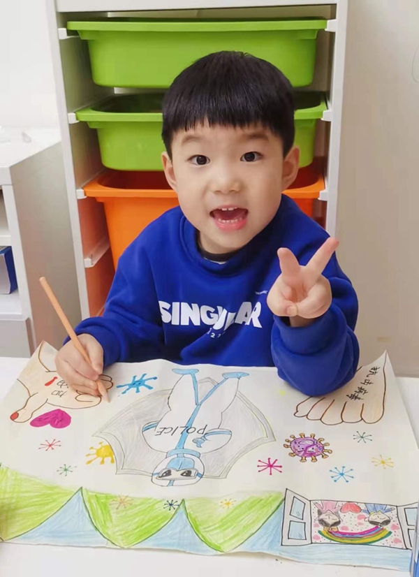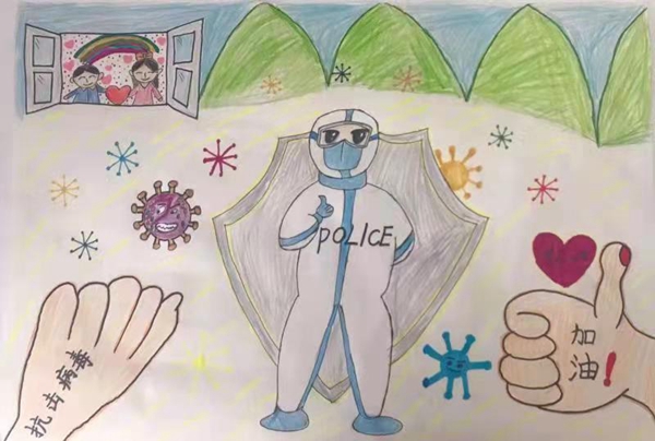 一天,正在执勤的韩帅阳收到妻子通过微信发来的图画,妻子说这是她和儿子两个人专门为他画的。画面中,一名身着防护服的警察在盾牌前面显得高大威猛,在他的保护下身边的病毒全部驱散在外,伸出的大拇指似乎在大家表示要相信自己,现在一切安好,画面的左上角是一名母亲带着自己的孩子微笑的看着警察。看到这张画后,韩帅阳的眼眶湿润了,他知道这是妻子和儿子在用这种方式鼓励自己,同时也表达了妻儿深深的思念之情,希望他平安回家。
