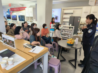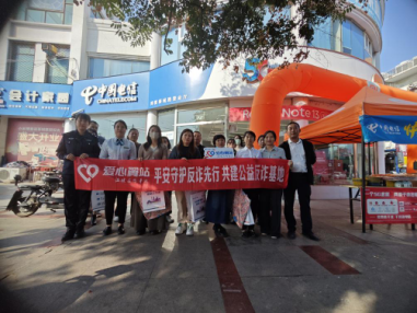 2023年11月2日上午,中国电信焦作分公司博爱葵城路营业厅开展了“爱心翼站-共建反诈公益基地“宣传活动。中国电信焦作分公司渠道中心城区总监郭玲、博爱营业部副经理杜小涛、中国电信博爱营业部副经理孙慧萍、焦作市博爱公安局反诈中心宣讲员许婉婉参加此次活动。