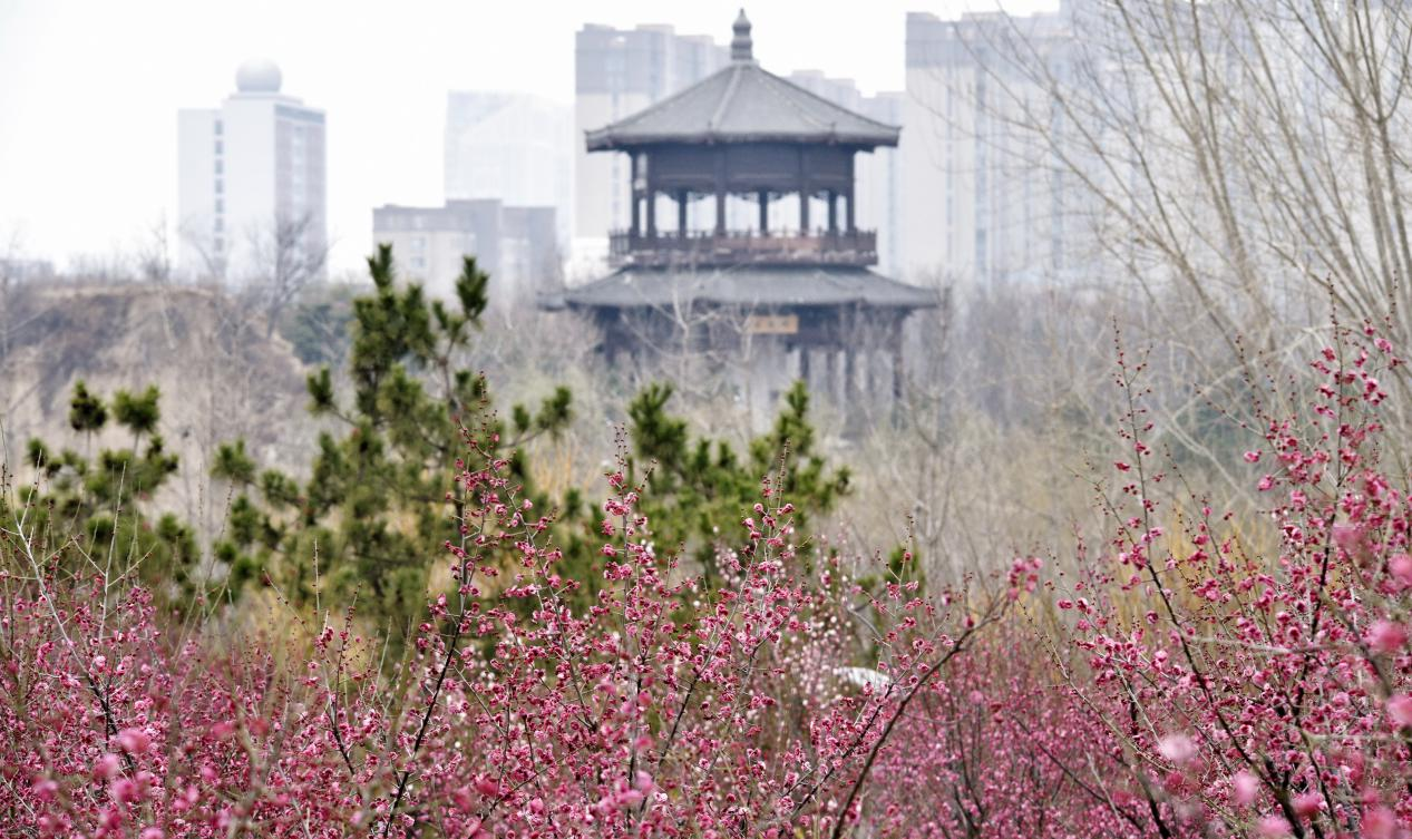 在郑州市西流湖公园,日前迎来赏梅的最佳时节,漫山的梅花竞相开放,灿若红霞,浓浓的春意扑面而来,花海沿湖盛开,芬芳吐艳,坠满枝头。微风拂过,幽香沁人心脾,此处成片的梅花与亭台楼阁相互辉映,构成一幅如诗如画的春景图。
