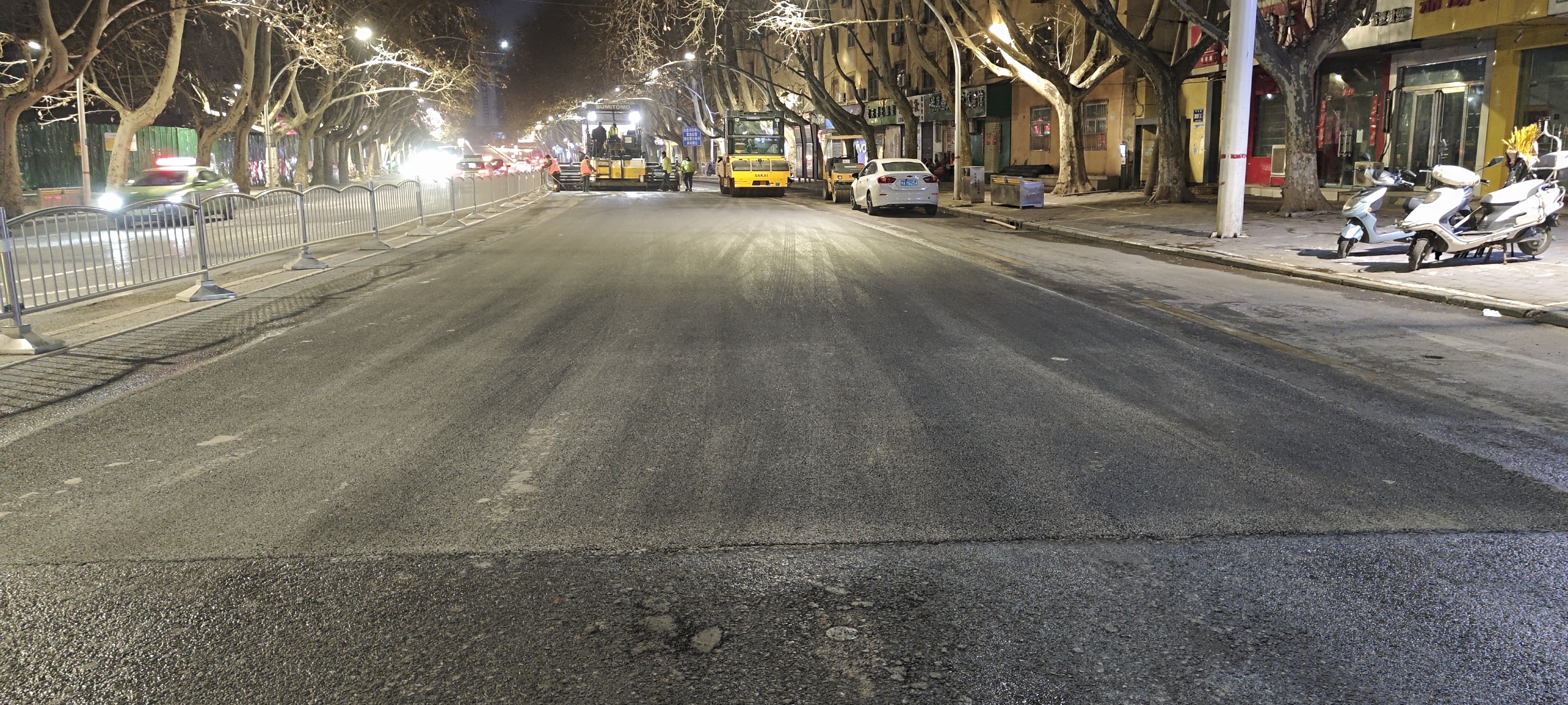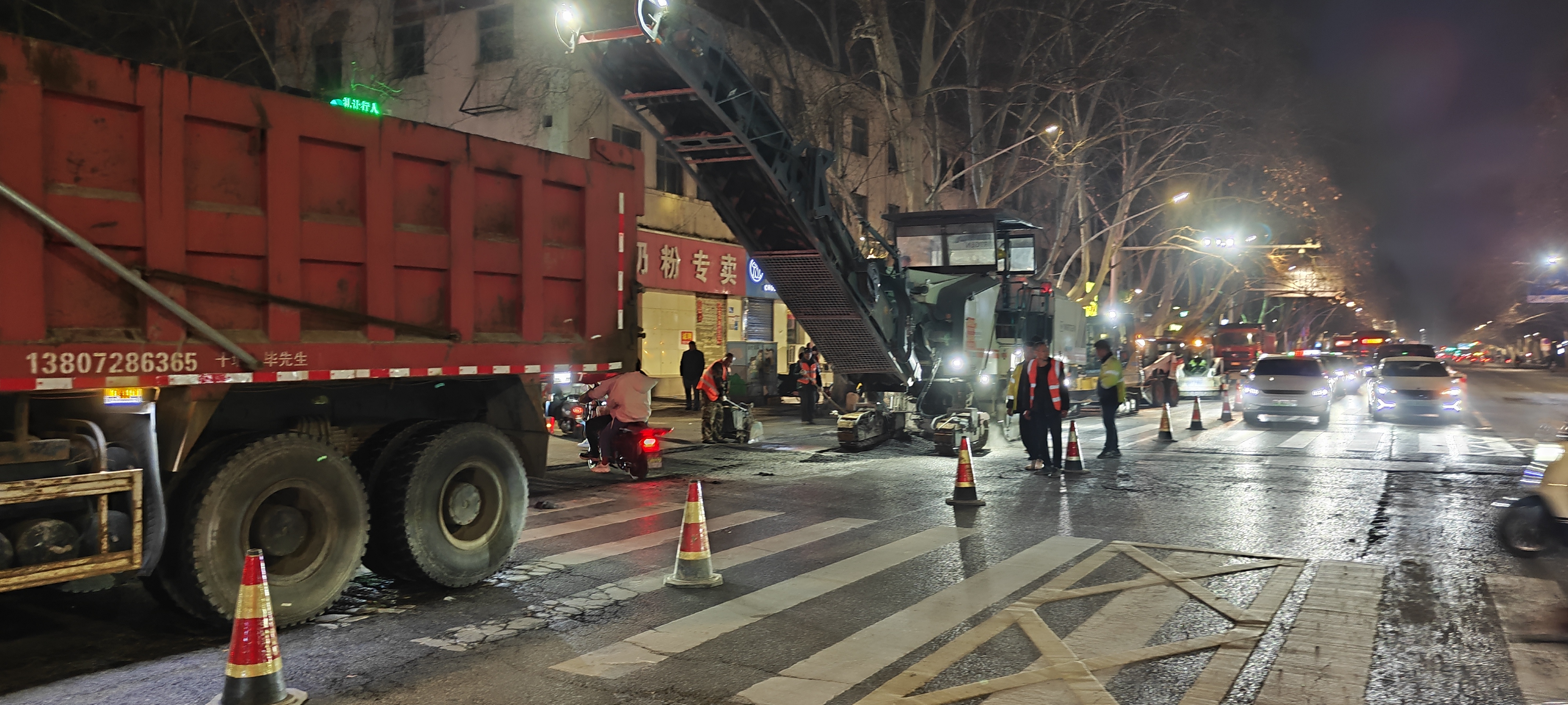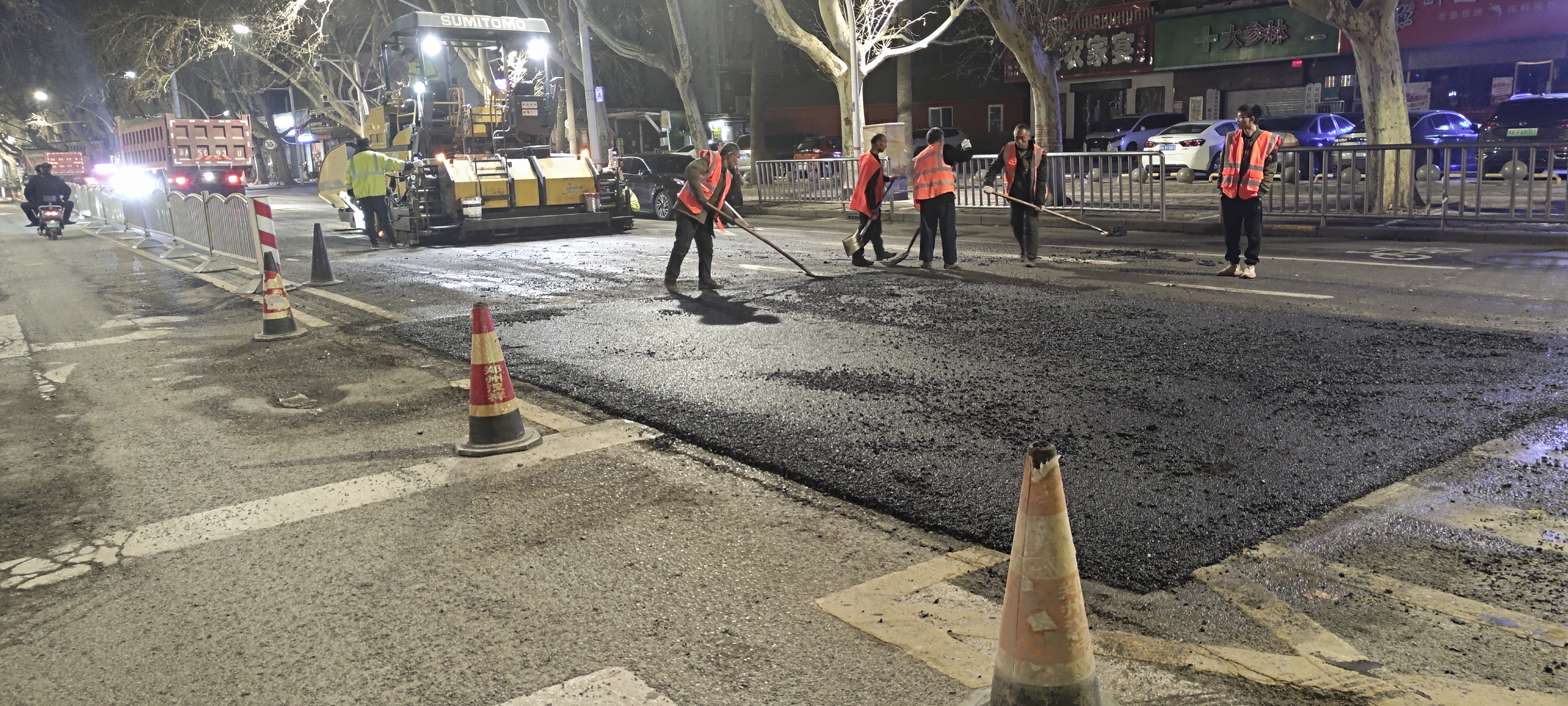 3月25日晚,当万家灯火逐渐熄灭,南阳路上却是一片热火朝天。36名金水区城管局市政所工作人员正配合着铣刨机、摊铺机、压路机迅速打开施工作业面,忙碌而有序地推进车行道铣刨、摊铺沥青。