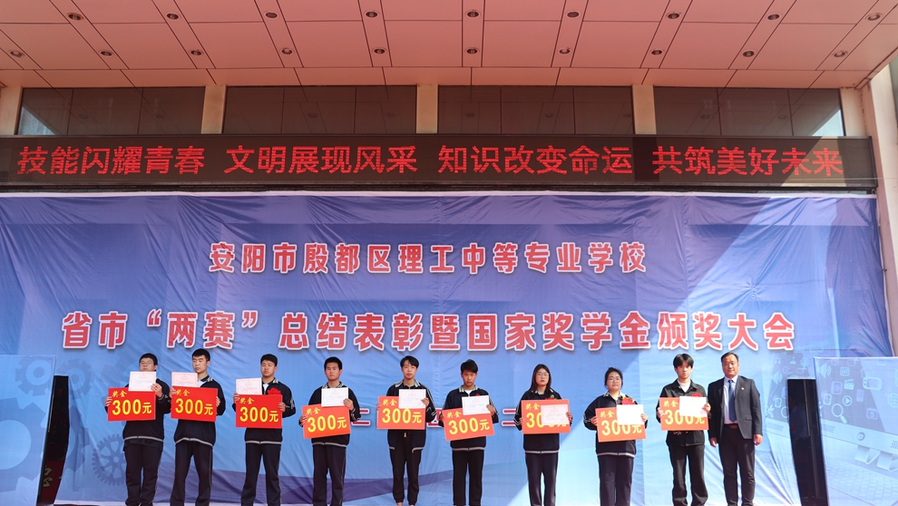 殷都区教育局党组成员,理工中专书记、校长张宏敏在讲话中谈到,近年来,学校秉承“志为大国工匠”的办学理念,教育教学质量和社会影响力不断提升,培养了一大批优秀师生,荣获了省“双高”学校等数十余项省市荣誉,实现了从规范管理到整体质量提升的跨越。希望全体同学以获奖同学为榜样,努力学习,苦练技能,为校争光,为社会发展做出贡献。也希望全体教职员工,以获奖教师、辅导教师为榜样,紧紧围绕学校工作目标,增强质量意识、责任意识和竞争意识,开拓创新,勇于担当,为2024年国家奖学金顺利评选及省市“两赛”顺利组织并取得更好成绩打下坚实基础。