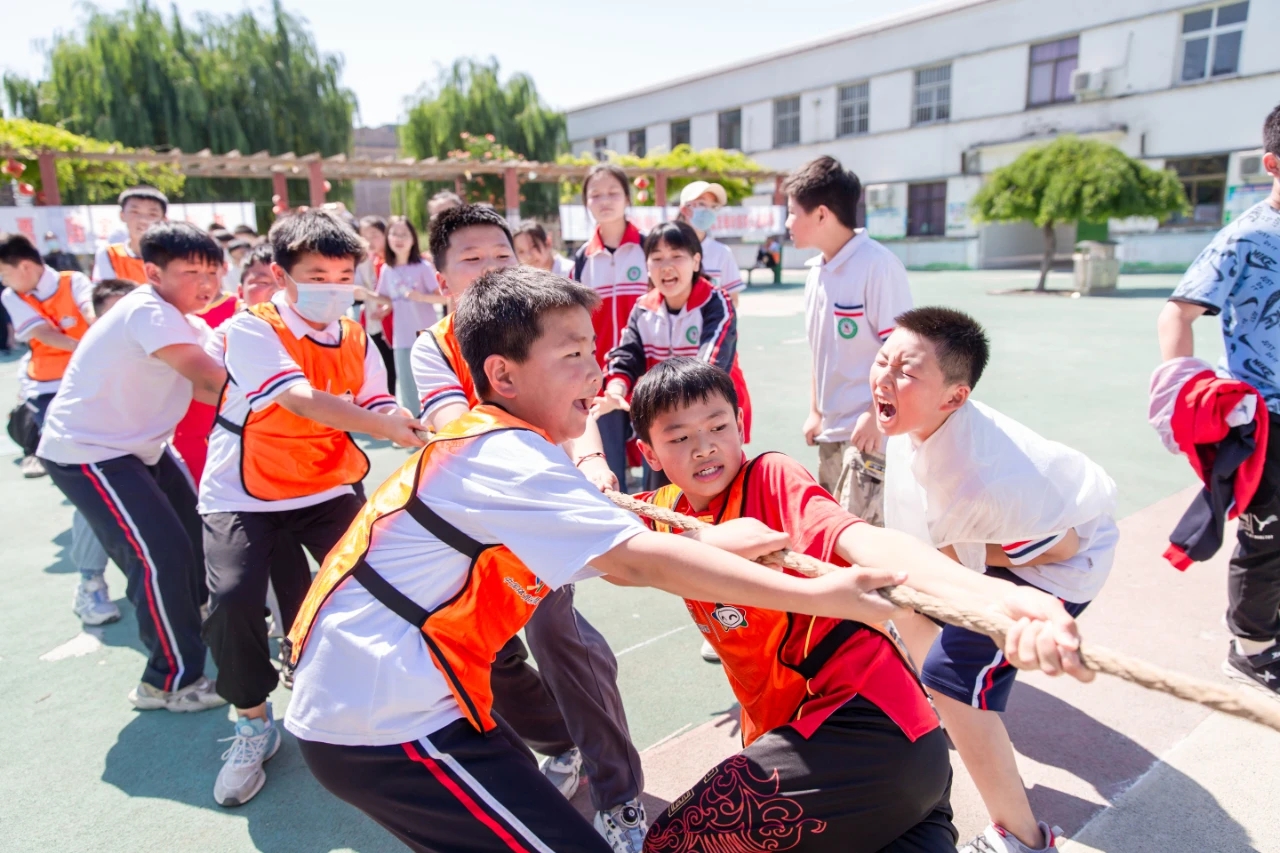 在简短的仪式结束后,身穿蓝、橙色的体彩对抗衫的孩子们和现场嘉宾开始了一场拔河比赛,随着一声哨响,震耳欲聋的加油声响彻了整个操场。