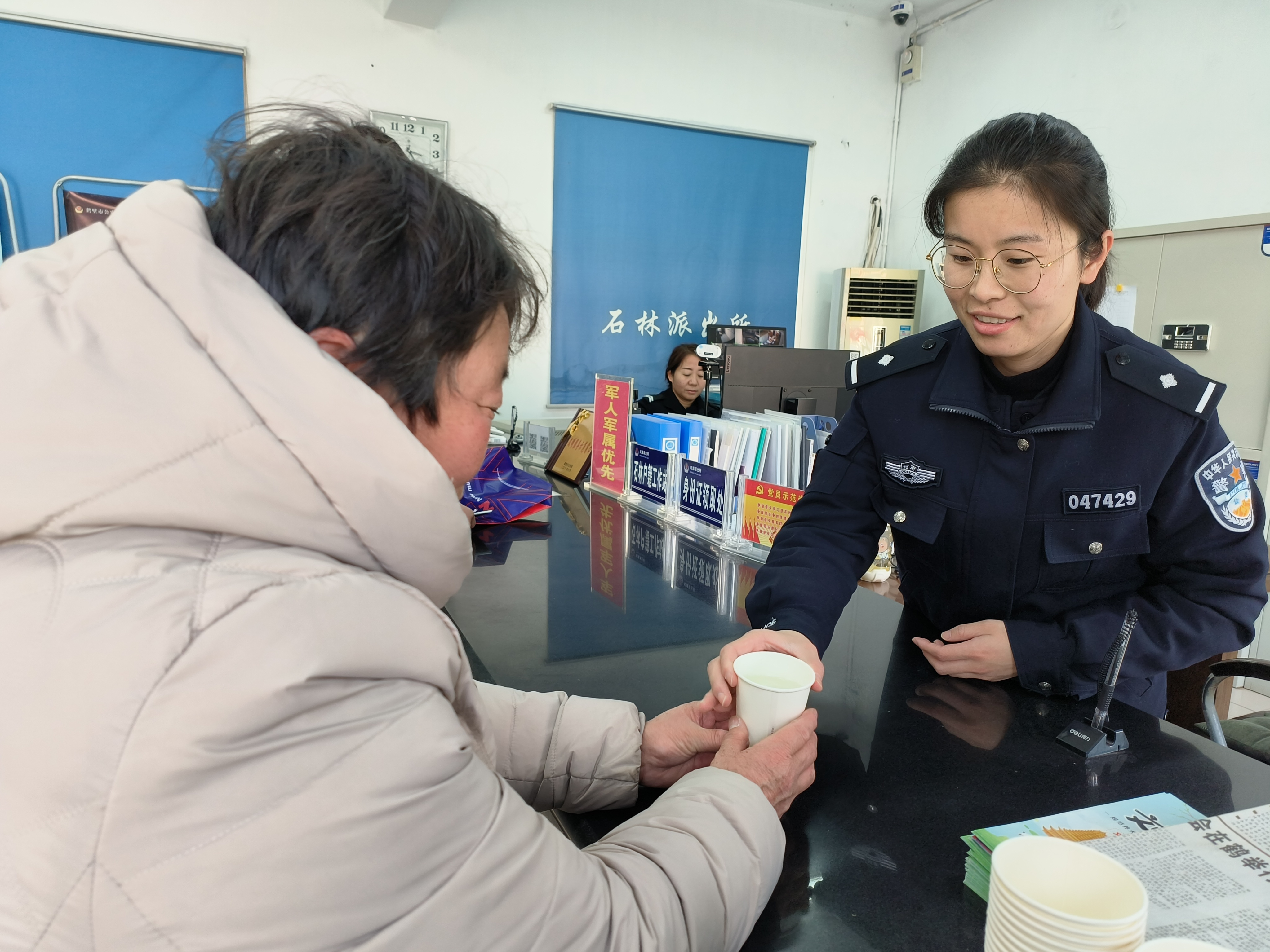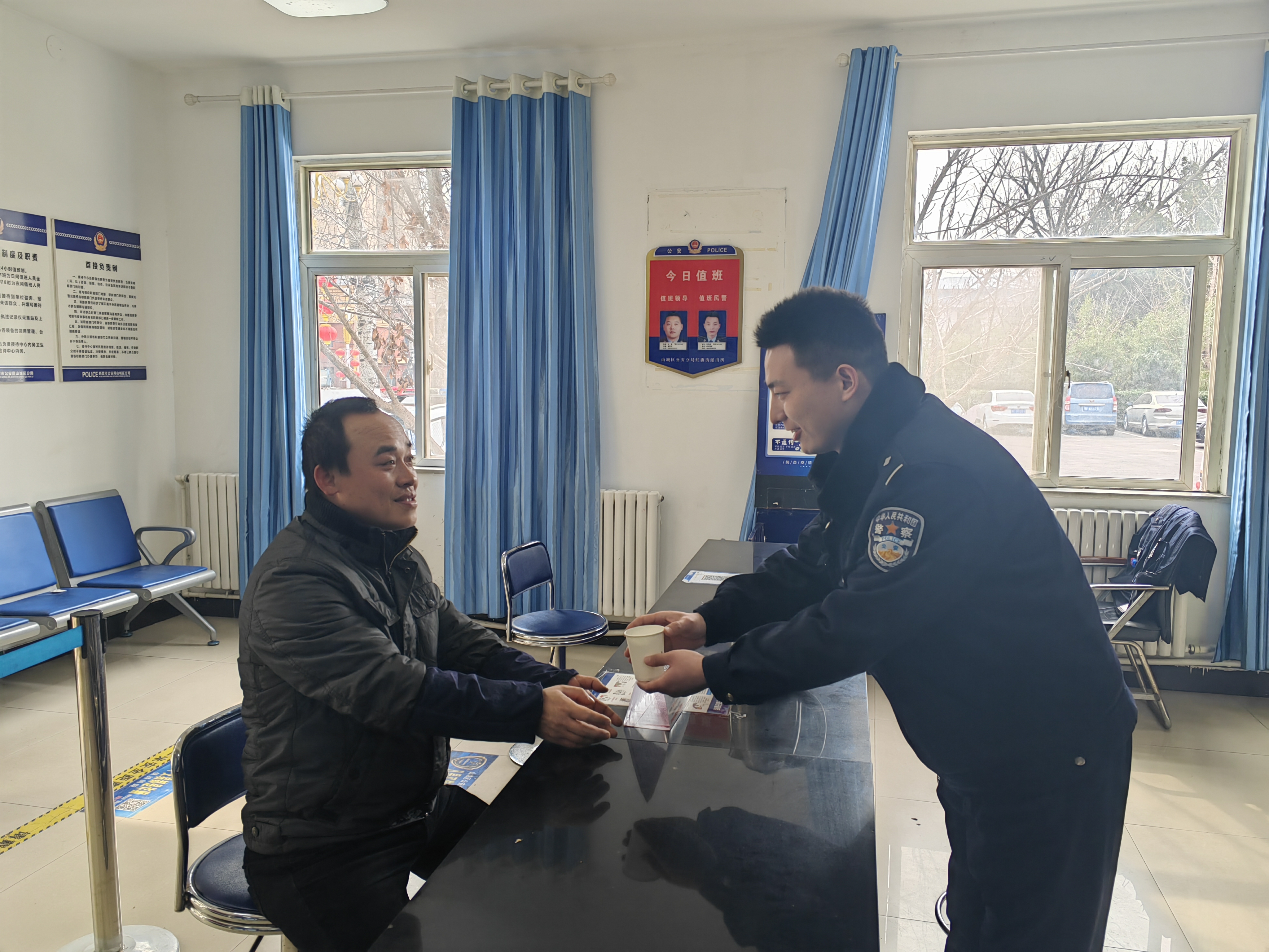 公安窗口是公安机关联系群众、密切警民关系的桥梁和纽带,窗口的环境秩序和工作人员的仪容仪表、处事态度、工作方法直接影响着公安机关在群众心目中的形象,为此,分局从细节着手,加强完善服务设施和秩序整顿,把公安窗口建成服务平台,配备饮水机、纸杯、座椅、笔纸、便民服务箱等物品,设置警民联系板、公开岗位职责,让群众感受到面面俱到的优质服务。要求窗口民辅警在工作时间保持严整的警容风貌和良好的精神状态,坚持“群众利益无小事”,做到一张笑脸相迎,一声问候关心、一把椅子相请,一杯清茶暖心,提高民警服务亲和力。
