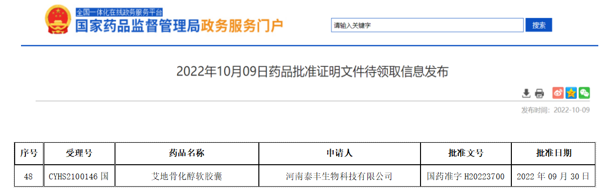 2022年10月9日,国家药品监督管理局发布公告,河南泰丰生物科技有限公司自主研发、生产、注册的艾地骨化醇软胶囊(商标名:艾骨醇),正式获得注册批件。艾地骨化醇软胶囊属于国谈品种,泰丰生物采用进口原料生产的“艾骨醇”是国外原研药国内首仿,意义重大!