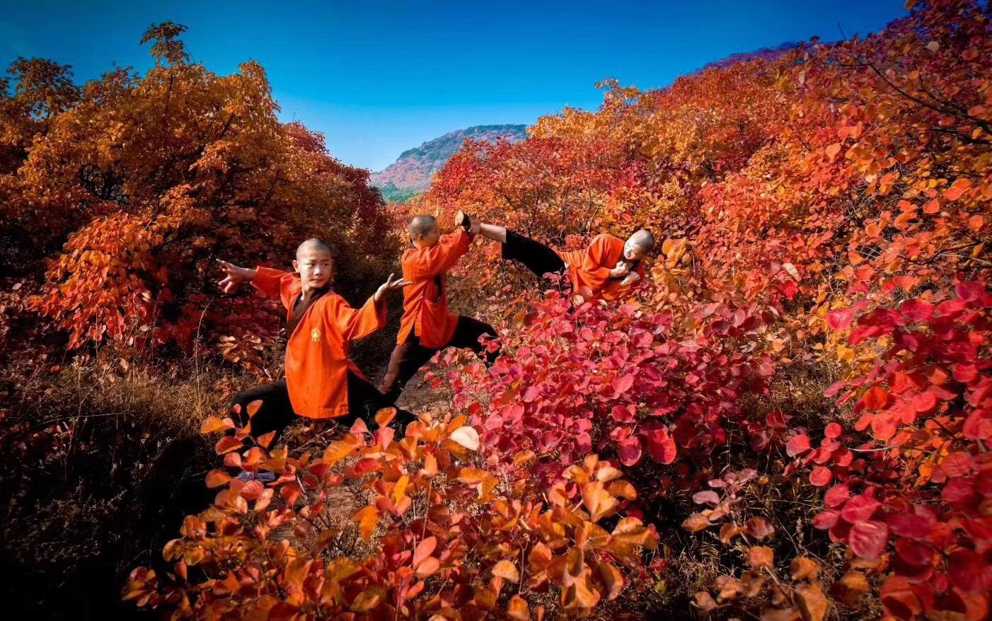 (图:嵩山红叶林中的功夫小子)