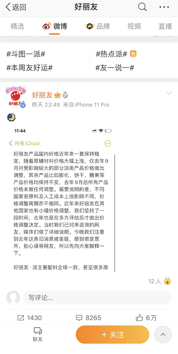 3月1日23:49分,该品牌在其官方微博回应。据好丽友微博显示,其产品国内(中国)价格近年来一直保持稳定,因为原辅材料价格大幅上涨,仅在去年(2021年)9月对受影响较大的部分派类产品价格进行了调整,其余产品价格保持不变。
