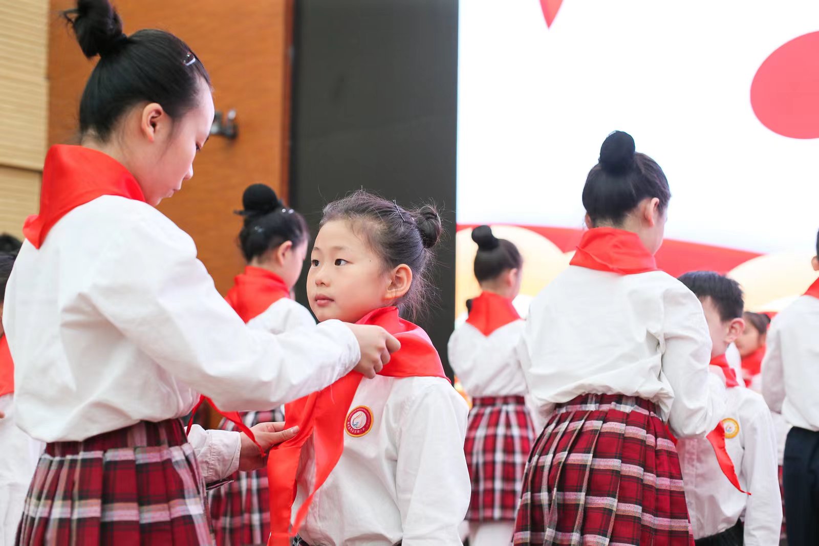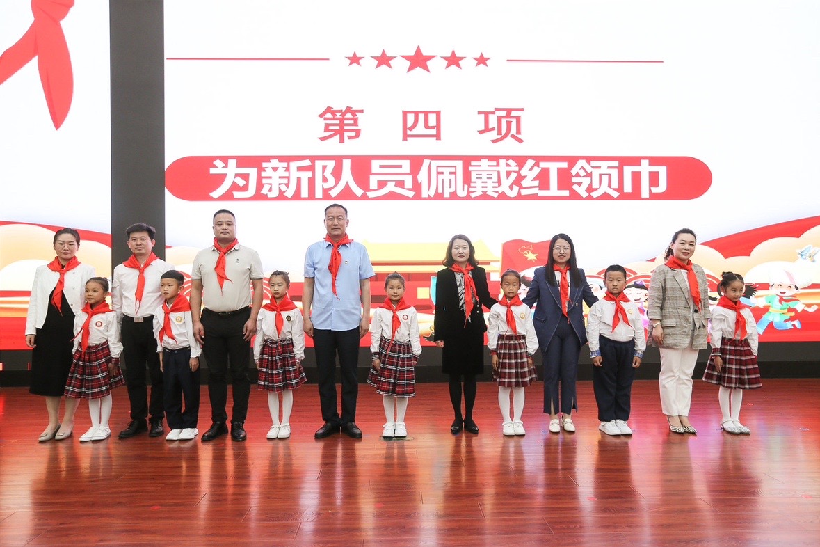 红领巾是骄傲、是传承、是希望;红领巾是责任、是奉献、是争先。大队长赵奂瑶宣读新队员名单后,一年级小凤凰们神采奕奕走上舞台,老队员为新队员佩戴红领巾,鲜艳的红领巾飘在胸前,幸福的笑容溢于脸上,他们小手举过头顶,庄严地献上自己的第一个队礼。