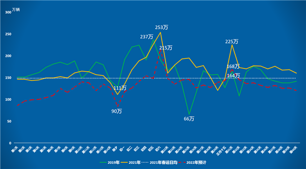根据往年同期高速路网运行数据,结合当前疫情防控政策,预计2022年春运期间(40天)高速公路出口总流量将接近5500万辆,日均约138万辆,为日常流量的90%,较2021年同比下降约20%。总体呈现客车出口流量较往年波动较大,而货车出口流量较往年波动较小的趋势。