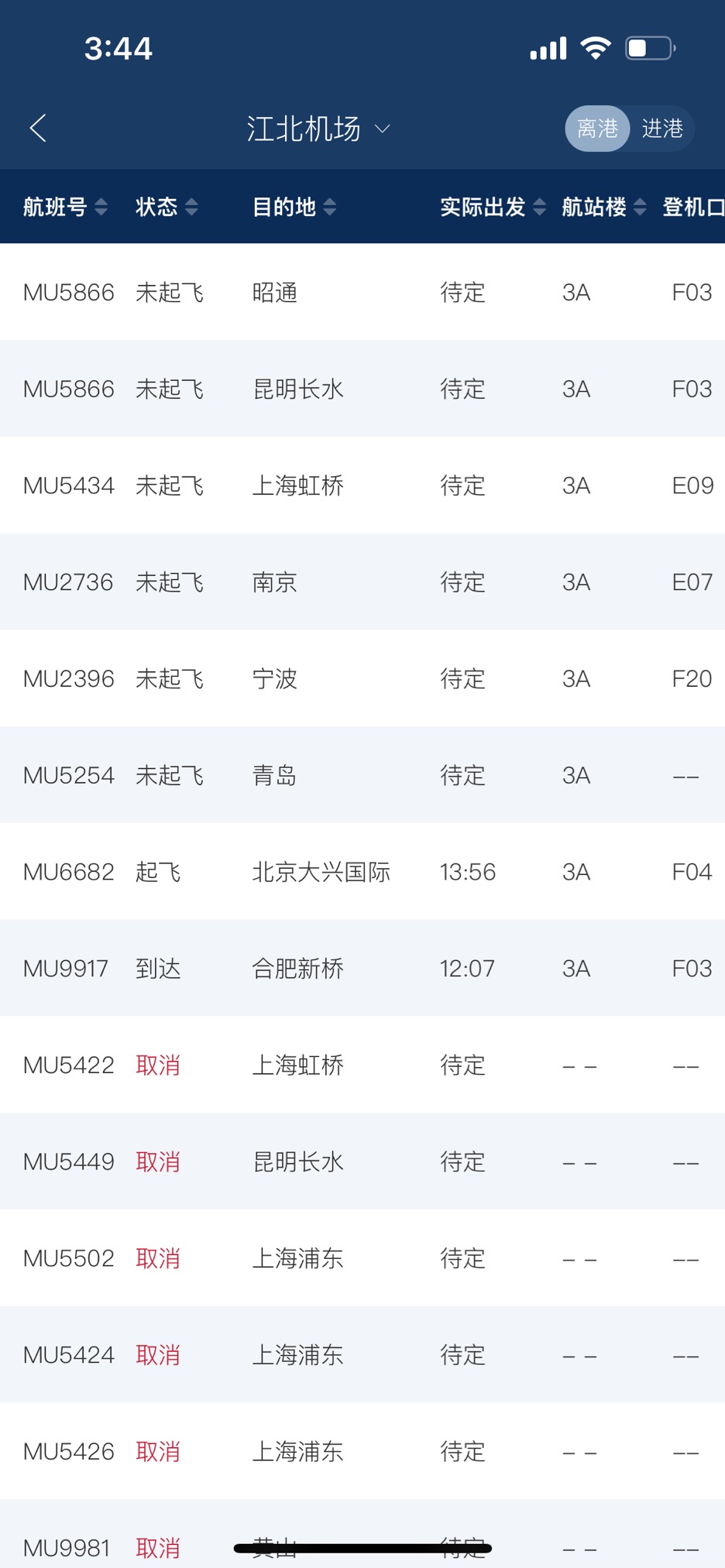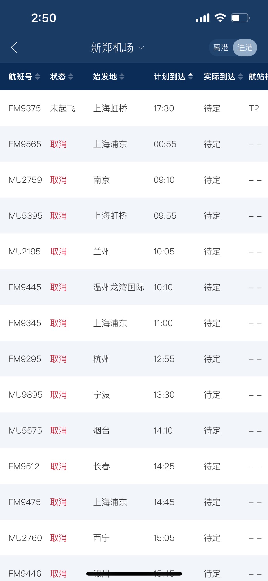以3月24为例,中国东方航空APP显示,其在郑州机场共有50个班次,其中包括离港的25个班次,24班次被取消;同样,出港25个班次,24个班次被取消,总的取消率达到96%。