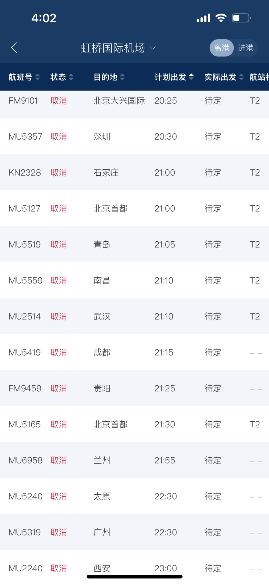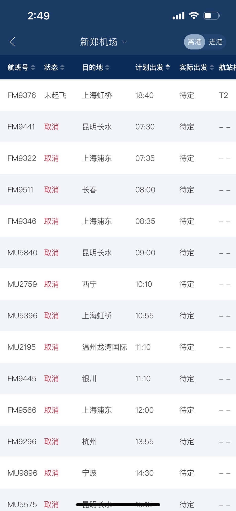 这种情况并不止在郑州机场。在全国热门机场上海虹桥机场,离港被取消的航班达到183班,占总离港班次的90%以上。